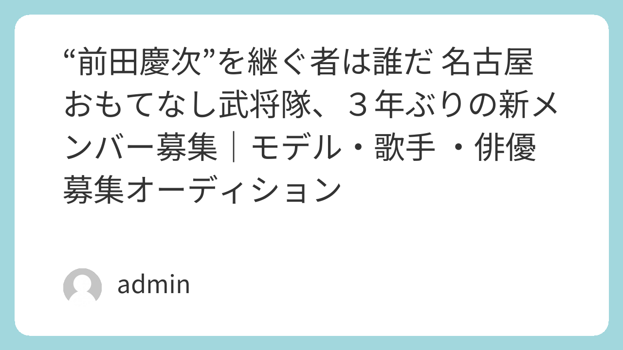| 募集内容 | 名古屋の魅力を全国へ発信する「名古屋おもてなし武将隊」。 観光促進にとどまらず、CDリリース、舞台公演、テレビ・ラジオなど各種メディア出演へと活動の幅を広げ、全国に広がる“武将隊文化”を牽引する存在となりました。 そしてこのたび、17年目の節目を迎えるにあたり、次代の前田慶次役を、新たに募集いたします 募集に関する詳細は下記URLをご確認ください。 求む、サムライ「前田慶次募集」 | 名古屋おもてなし武将隊®新メンバーオーディション開催 求む、侍!月給制で戦国武将。名古屋おもてなし武将隊®が新メンバーを募集します。月給20万円+出来高。社会保険完備で天下取り。 |