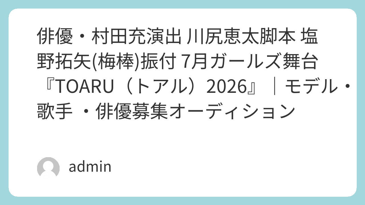| 募集内容 | 【情熱のある個性的な俳優を募集】 出演者は全員女性です。 20年の実績を誇るLIVEDOGによる、一般的に言うガールズ演劇・アイドル公演とは全く違った、本当の演劇・本当の芝居づくりを一流のスタッフ陣と稽古を通じて追求し、「職業・俳優」として将来闘っていきたい人材を育成する企画。 演劇ユニット「SUGARBOY」主宰で、ミュージカル「青春-AOHARU-鉄道」(脚本・演出)、超ハジケステージ☆ボボボーボ・ボーボボ(脚本・総合演出)、等の舞台の他、TVドラマやラジオの放送作家としても活躍する川尻恵太による脚本を、人気舞台「HUNTER×HUNTER THE STAGE 2」のノブナガ役、『進撃の巨人 -the Musical-』のハンネス役 等、舞台や映画等で活躍する俳優の村田充が演出を担当し、人気ダンスユニット「梅棒」の塩野拓矢によるダンス振付で作品を華やかに彩られた、笑って泣ける青春コメディ作品「TOARU(トアル)2026」を、2026年7月、中目黒キンケロ・シアターにて18ステージを上演するにあたり、技術や経験よりも、大きな夢と情熱を持った、個性豊かでパワーみなぎる女性キャストを募集する。 チケットノルマ無し!アンサンブル(セリフの無い役)での出演は一切無し! <公演概要> <稽古> <選考方法> |