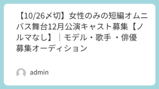舞台 【10/26〆切】女性のみの短編オムニバス舞台12月公演キャスト募集【ノルマなし】|モデル・歌手 ・俳優募集オーディション 【【10/26〆切】女性のみの短編オムニバス舞台12月公演キャスト募集【ノルマなし】】締切日:2025年10月26日の詳細情報。応募資格・募集要項・審査の流れ・応募方法を徹底解説。モデル・歌手・俳優など幅広く募集しています。 舞台
