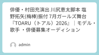 舞台 俳優・村田充演出 川尻恵太脚本 塩野拓矢(梅棒)振付 7月ガールズ舞台『TOARU(トアル)2026』|モデル・歌手 ・俳優募集オーディション 【俳優・村田充演出 川尻恵太脚本 塩野拓矢(梅棒)振付 7月ガールズ舞台『TOARU(トアル)2026』】締切日:2026年2月23日の詳細情報。応募資格・募集要項・審査の流れ・応募方法を徹底解説。モデル・歌手・俳優など幅広く募集しています。 舞台