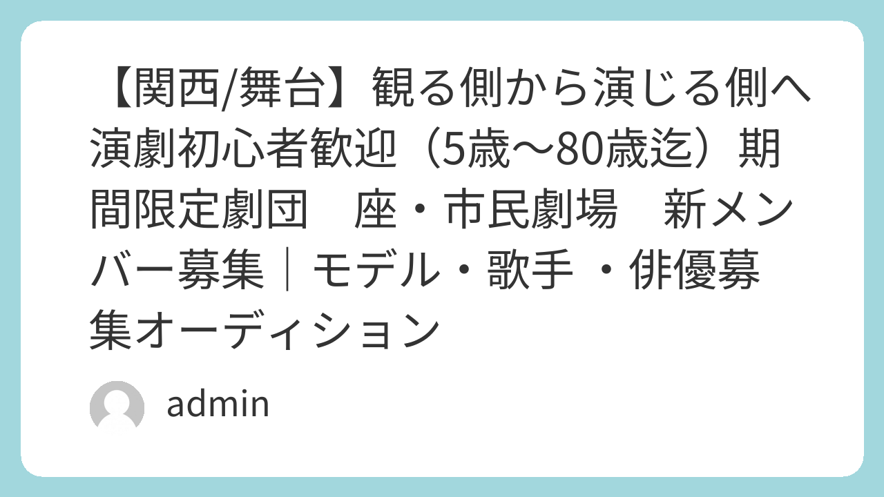 | 応募資格 | 男女│5歳~80歳│初心者歓迎, 有料│演劇未経験者歓迎!国籍・プロ・アマ経験不問 ※神戸大阪市以外の方も稽古場通えればOK 特定のプロダクションへ所属の方は承諾が必要。親子参加、友達同士の参加OK |