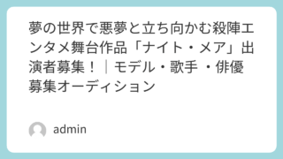 舞台 夢の世界で悪夢と立ち向かむ殺陣エンタメ舞台作品「ナイト・メア」出演者募集!|モデル・歌手 ・俳優募集オーディション 【夢の世界で悪夢と立ち向かむ殺陣エンタメ舞台作品「ナイト・メア」出演者募集!】締切日:2026年1月20日の詳細情報。応募資格・募集要項・審査の流れ・応募方法を徹底解説。モデル・歌手・俳優など幅広く募集しています。 舞台